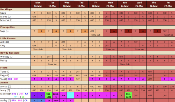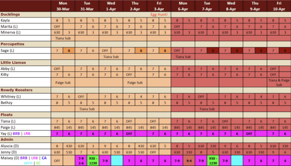 - If you are not a lead teacher or if you have completed all lesson planning, please work on our weekly cleaning lists in the morning. These lists are already posted in the classrooms!